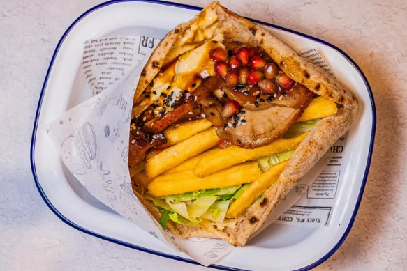 Savor tender chicken wrapped in warm pita with a hint of garlic and herbs.